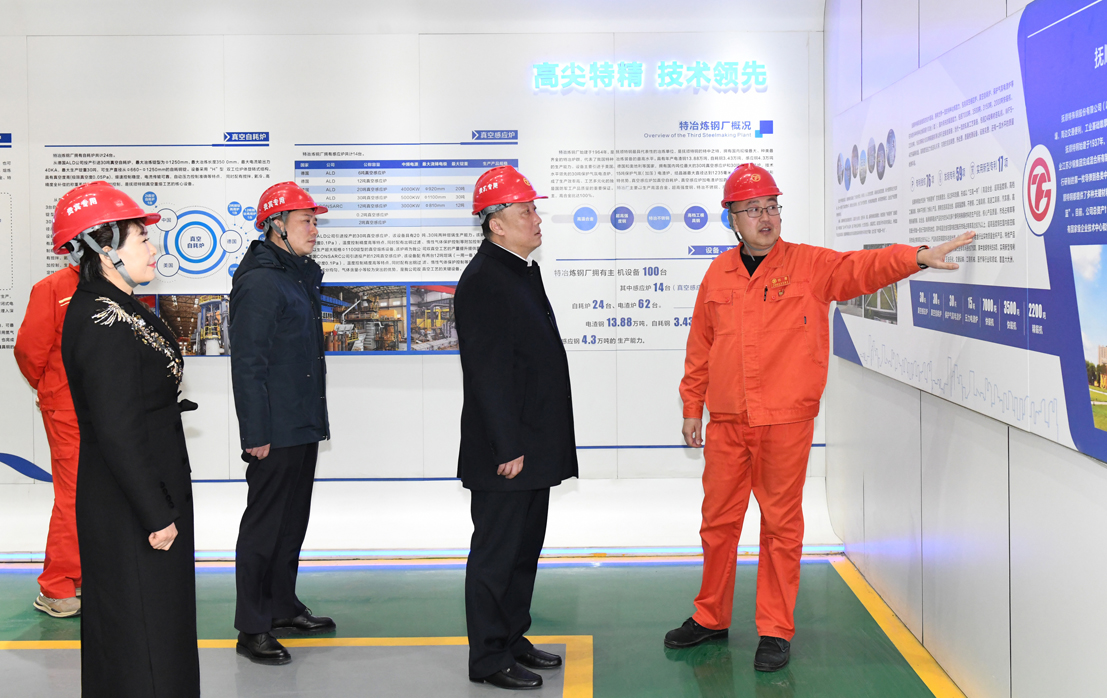 在公司產(chǎn)業(yè)化一期生產(chǎn)現(xiàn)場,胡哲一行觀看了特冶生產(chǎn)裝備,詳細(xì)詢問了設(shè)備產(chǎn)能、產(chǎn)品質(zhì)量及技改工程建設(shè)等情況。祁勇向胡哲一行詳細(xì)介紹了撫順特鋼近年來的生產(chǎn)經(jīng)營、技改項(xiàng)目建設(shè)和發(fā)展新質(zhì)生產(chǎn)力等方面情況。當(dāng)?shù)弥獡犴樚劁搱?jiān)持“特鋼更特”發(fā)展理念,在現(xiàn)階段鋼鐵行業(yè)市場低迷的情況下,企業(yè)生產(chǎn)經(jīng)營保持了良好勢頭,新建的特冶技改項(xiàng)目已經(jīng)陸續(xù)投產(chǎn),特冶產(chǎn)能不斷增加時(shí),胡哲一行對(duì)撫順特鋼的快速、高質(zhì)量發(fā)展給予了高度評(píng)價(jià)。他表示,撫順特鋼的高質(zhì)量發(fā)展振奮人心,希望撫順特鋼繼續(xù)保持良好的發(fā)展勢頭,圍繞發(fā)展新質(zhì)生產(chǎn)力持續(xù)發(fā)力,為撫順地方經(jīng)濟(jì)發(fā)展再做新貢獻(xiàn),撫順市委、市政府將持續(xù)優(yōu)化營商環(huán)境,全力支持撫順特鋼的高質(zhì)量發(fā)展。